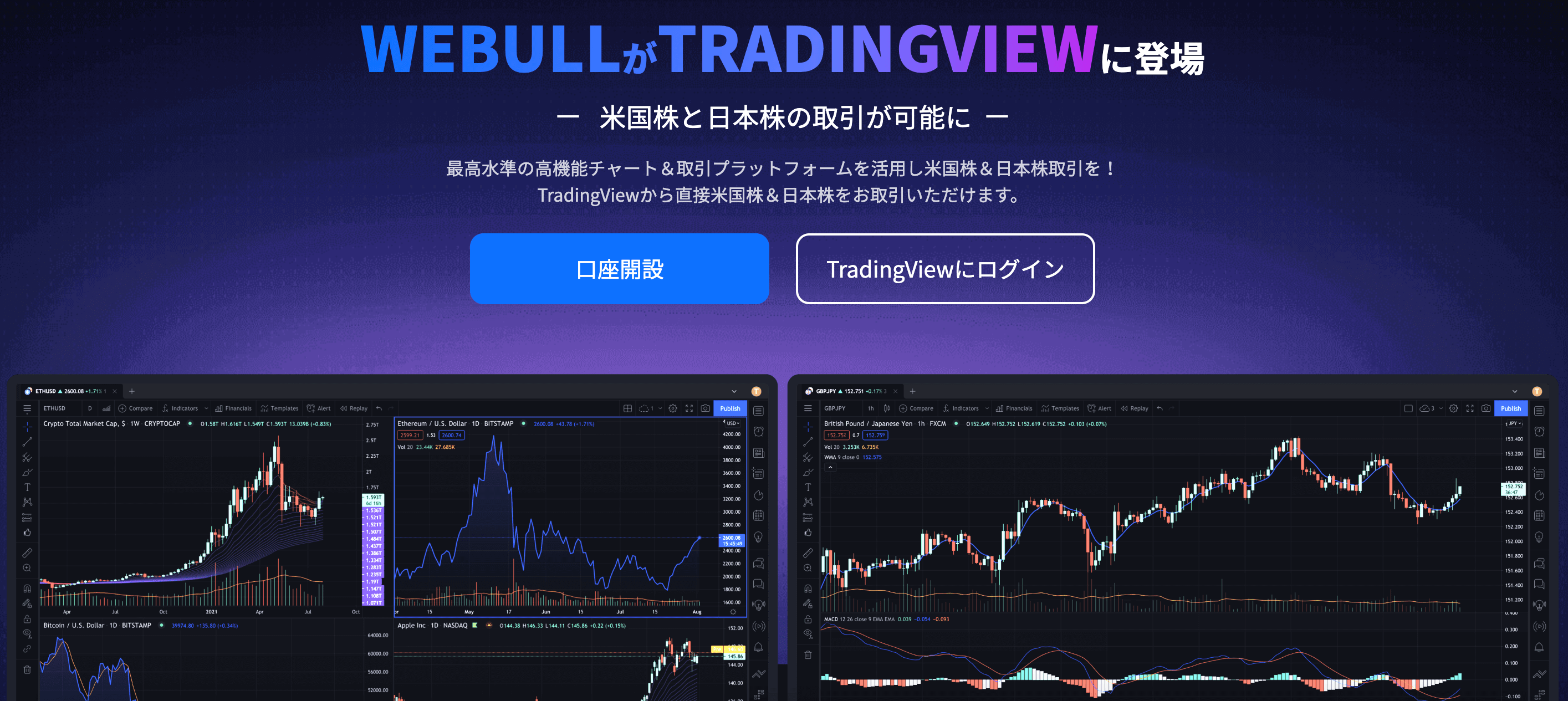 ウィブル証券はTradingViewと連携して米国株と日本株の取引ができます。