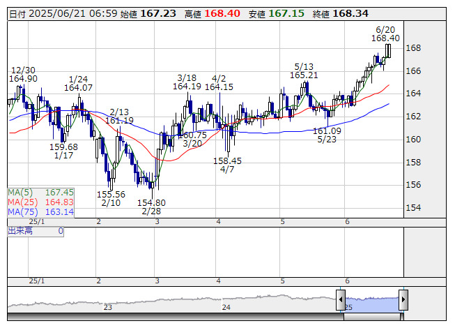 ユーロ/円 <日足> 「株探」多機能チャートより■強含み、ECBによる利下げ終了の思惑強まる
