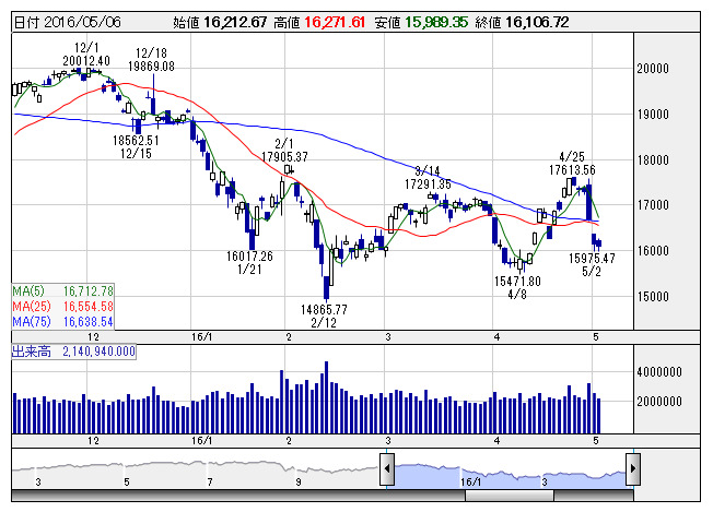 5月相場の幕開けとなった前週(5月2日-6日)は、3連休を挟んだ週初、週末の2営業日のみでした。特異日こそ巡ってきはしなかったものの、「2日新甫は荒れる」の格言通り、2日(月)は前の週の日銀ショックを引きずって518円安で引け、6日(金)も40円安と6日連続安となりました。