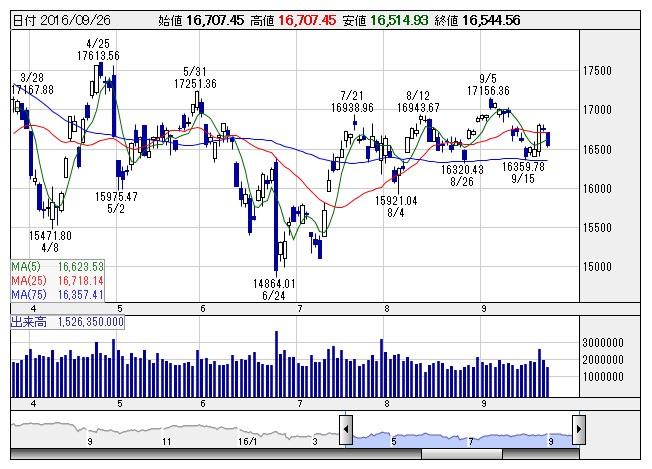大引け 16544.56(前日比 -209.46 、 -1.25% )
