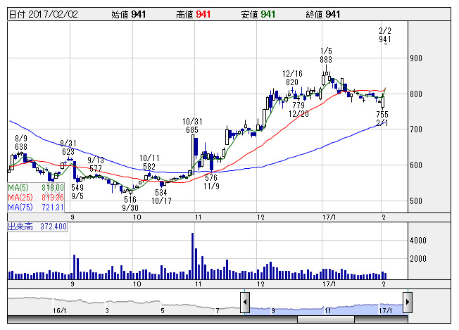 ショーワ <日足> 「株探」多機能チャートより■ショーワ <7274> 941円 (+150円、+19.0%) ストップ高