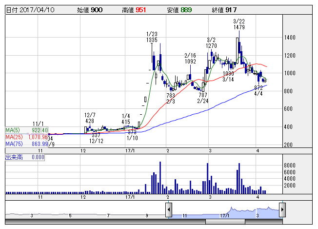 サイステップ <3810> [東証M] 気配 17年5月期業績予想の上方修正を好感