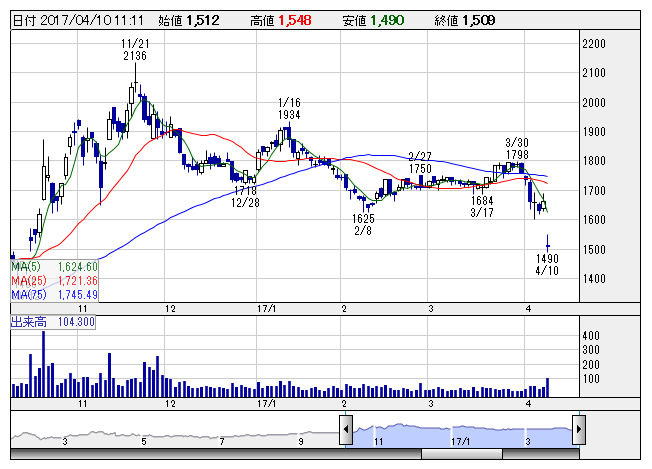 1. <3454> Fブラザーズ 東証1 -9.6 1502 17/11期1Q減益も17/11期通期は積極的な賃貸不動産投資等で過去最高益を見込む