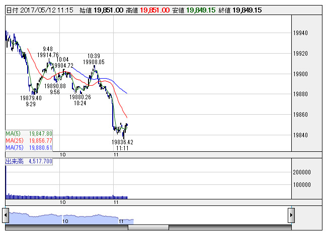 日経平均 <1分足> 「株探」多機能チャートより個別ではNEXT FUNDS 野村企業価値分配指数連動型 <1480> 、iシェアーズ フロンティア株 <1583> 、ダイワ食品 上場投信TOPIX-17 <1634> 、iシェアーズ エマージング株 <1582> 、NEXT 情通サ他 <1626> など13銘柄が新高値。ETFS 銀上場投資信託 <1673> が新安値をつけた。
