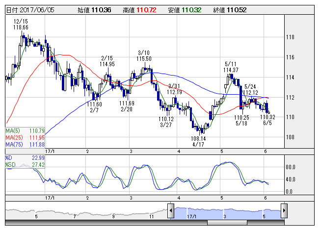 2017年06月05日18時01分 【通貨】外為:1ドル110円48銭前後と横ばい圏で推移 ドル円 <日足> Slowストキャス 「株探」多機能チャートより 5日の外国為替市場のドル円相場は午後6時時点で1ドル=110円48銭前後と、午後5時時点に比べ4銭のドル安・円高と横ばい圏。ユーロ円は1ユーロ=124円52銭前後と2銭のユーロ高・円安と横ばい圏で推移している。 株探ニュース