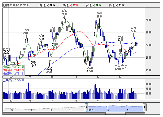 日立建機 <日足> 「株探」多機能チャートより※この業績予想は2017年6月7日に執筆されたものです。最新の情報が反映されていない場合がありますのでご了承ください。