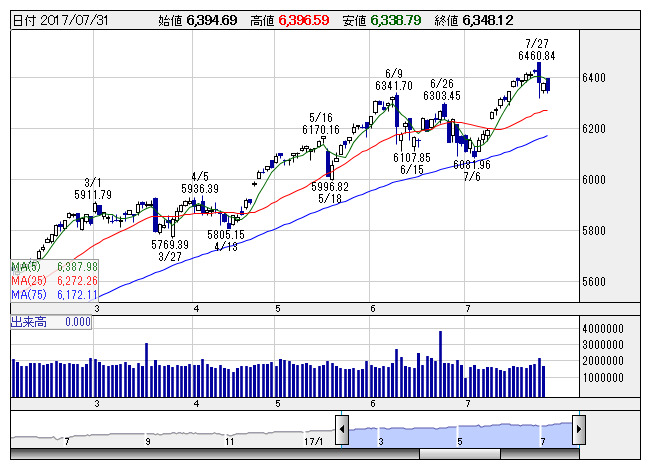 NASDAQ <日足> 「株探」多機能チャートより31日の米国株式相場はまちまち。ダウ平均は60.81ドル高の21891.12、ナスダックは26.55ポイント安の6348.12で取引を終了した。大半の主要企業決算が好調であることから投資家心理が改善し、買いが先行。一方で、ハイテク株が売られたほか、原油相場の下落に伴い、上げ幅を縮小した。今週発表される主要決算や雇用統計結果を見極めたいとの思惑から下値は限られた。セクター別では、食品・生活必需品小売やメディアが上昇する一方で素材や小売が下落した。