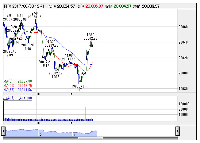 【市況】13時の日経平均は49円安の2万30円、東エレクが11.29円押し下げ
