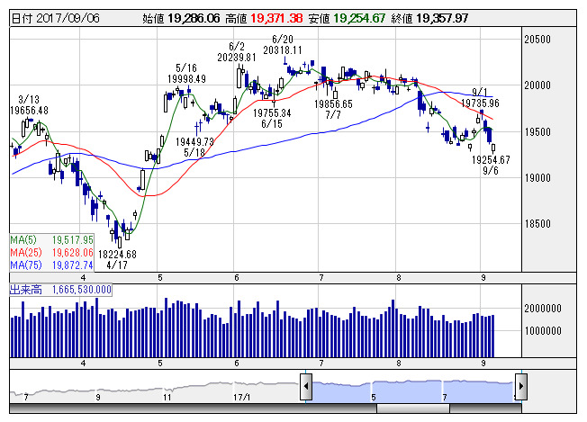 9月6日の安値1万9254円が押し目底になるなら、目先は勢いの強い上昇の流れを作り、一気に1日の高値1万9735円へ接近する公算です。