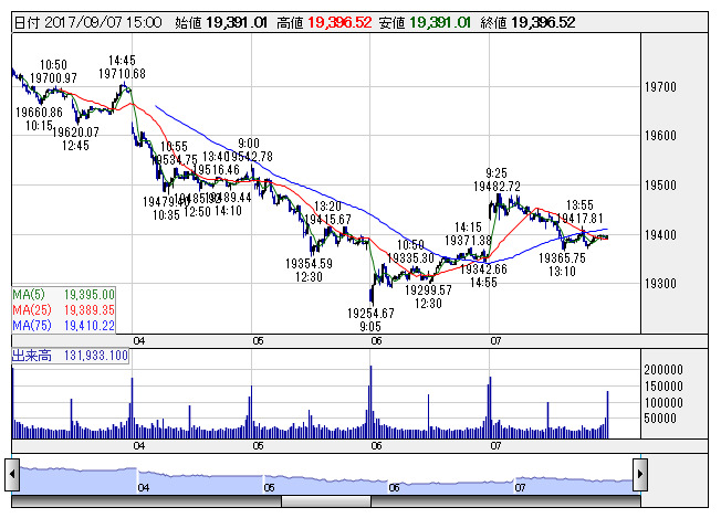 2017年09月08日09時01分 【市況】日経平均8日寄り付き=98円安、1万9297円 日経平均 <5分足> 「株探」多機能チャートより 8日の日経平均株価は前日比98.56円安の1万9297.96円で寄り付いた。 株探ニュース