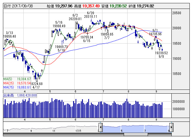 2017年09月09日10時15分 【市況】シカゴ日経平均先物 大取終値比 10円高 (9月8日) 日経平均 <日足> 「株探」多機能チャートよりシカゴ日経225先物12月限 (円建て) 19150 ( +10 ) シカゴ日経225先物12月限 (ドル建て) 19200 ( +60 ) ※( )は大阪取引所終値比 株探ニュース