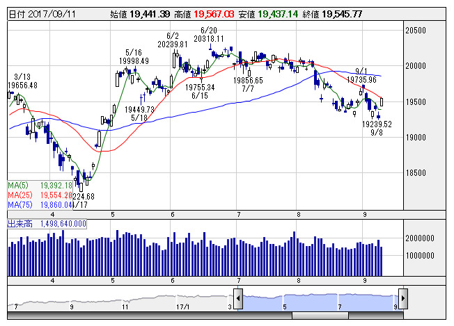 日経平均 <日足> 「株探」多機能チャートより日経平均株価は、昨日一気に1万9500円以上へ値を戻したことで、現在が5月からのもちあいの動きの途中か、押し目底をつけた後の上げ場面のどちらかだと考えられます。
