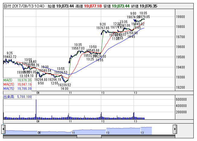【市況】11時の日経平均は84円高の1万9860円、日清紡HDが11.29円押し上げ