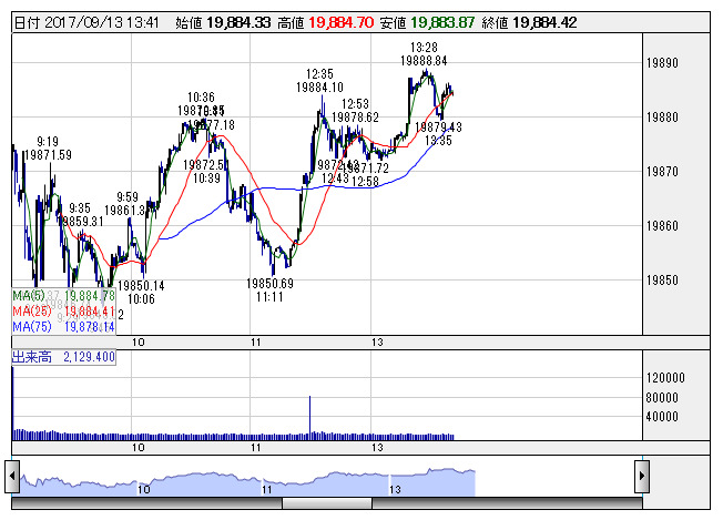 【市況】14時の日経平均は101円高の1万9877円、日清紡HDが11.29円押し上げ
