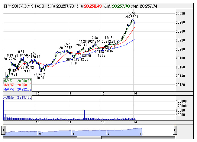 2017年09月19日14時23分 【市況】日経平均の上げ幅が400円突破 日経平均 <1分足> 「株探」多機能チャートより 日経平均株価の上げ幅が400円を突破。14時22分現在、401.82円高の2万311.32円まで上昇している。 株探ニュース