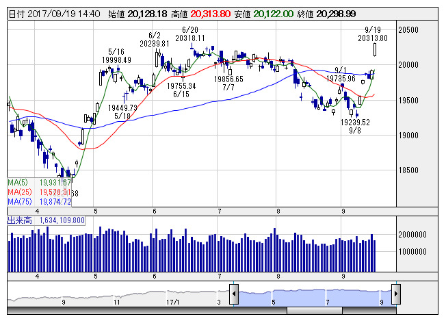 【市況】日経平均19日大引け=続伸、389円高の2万299円