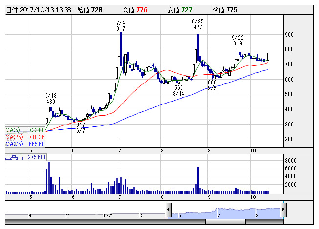 2928>傘下で経営再建を進めているが、RIZAPの株価が9月下旬を境に13週移動平均線を足場に一段高となっており、700円台前半で売り物をこなしていた同社株にもその連想から物色の矛先が向かっている。ジンズメイトの18年3月期第2四半期累計の業績は営業損失2億7200万円と前期実績と比較して赤字幅が拡大したものの、9月度の既存店売上高は前年同月比19.2%増と2ケタ伸長をみせるなど大幅に改善色をみせている。