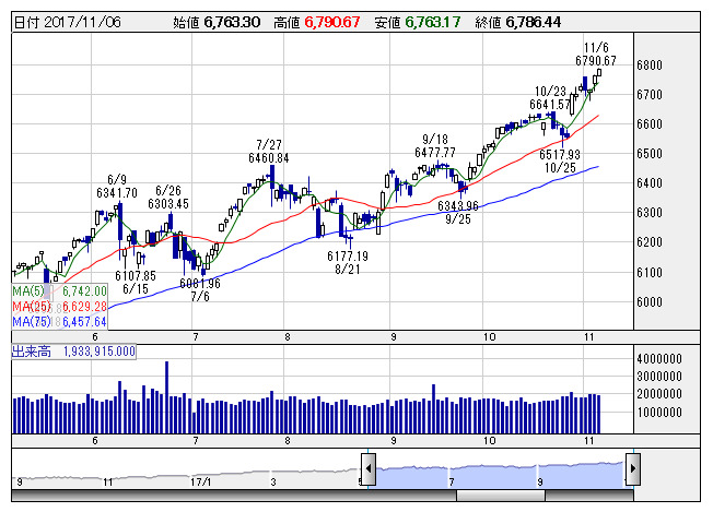 NASDAQ <日足> 「株探」多機能チャートより7日の米国株式相場はまちまち。ダウ平均は8.81ドル高の23557.23、ナスダックは18.65ポイント安の6767.78で取引を終了した。主要株価が連日最高値を更新した流れを受けて買いが先行したものの、その後は主要経済指標に乏しく、米長期金利の下落から金融セクターが売り込まれ下落に転じた。一方で、税制改革への期待から下値は限られた。ダウは最高値を更新。セクター別では、公益事業や食品・飲料・タバコが上昇する一方で銀行や小売が下落した。