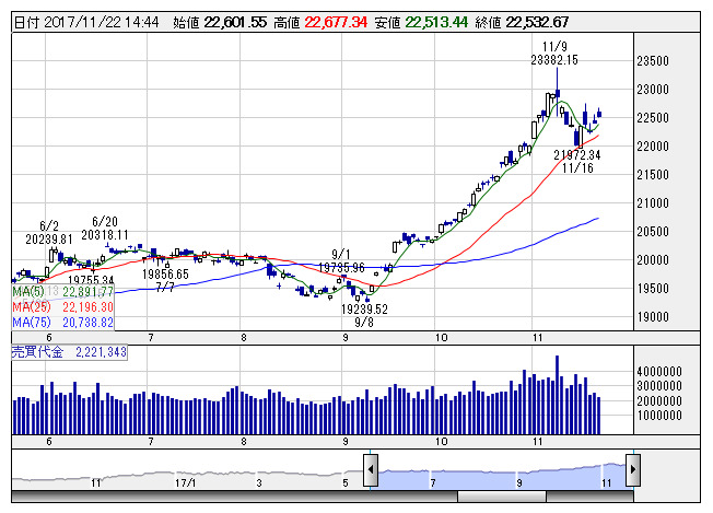 日経平均 <日足> 売買代金 「株探」多機能チャートより個別ではNEXT S&P500 VIX インバース <2049> 、上場インデックス中国H株 <1548> 、NEXT 香港ハンセンダブル・ブル <2031> 、中国H株ブル2倍上場投信 <1572> 、ダイワ小売上場投信・TOPIX-17 <1647> など9銘柄が新高値。国際のETF VIX短期先物指数 <1552> 、中国H株ベア上場投信 <1573> 、iシェアーズ・コア米国債7-10年 ETF <1656> 、NEXT 香港ハンセン・ベア <2032> が新安値をつけた。
