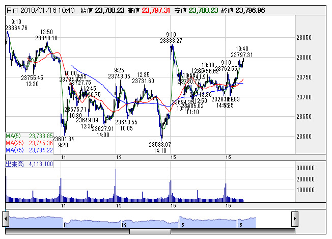 【市況】11時の日経平均は92円高の2万3807円、ファナックが23.38円押し上げ