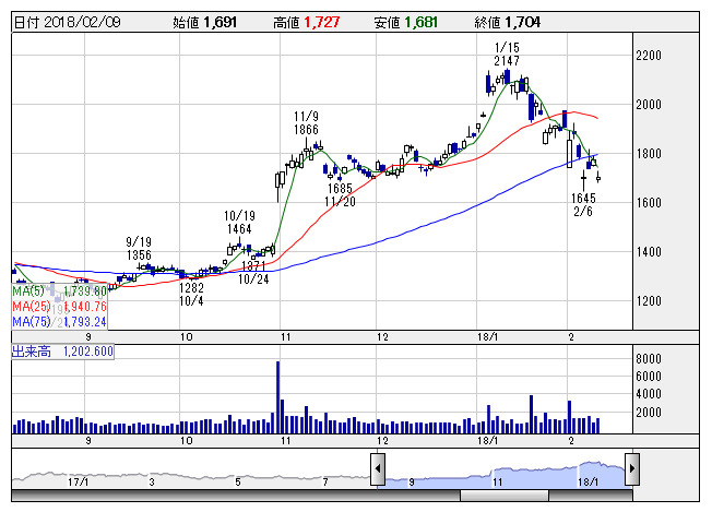 タダノ <日足> 「株探」多機能チャートより※この業績予想は2018年2月1日に執筆されたものです。最新の情報が反映されていない場合がありますのでご了承ください。