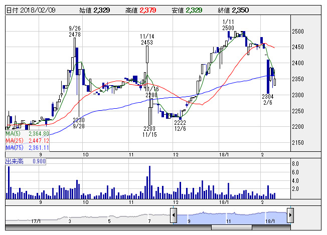 マミーマート <日足> 「株探」多機能チャートより※この業績予想は2018年2月1日に執筆されたものです。最新の情報が反映されていない場合がありますのでご了承ください。