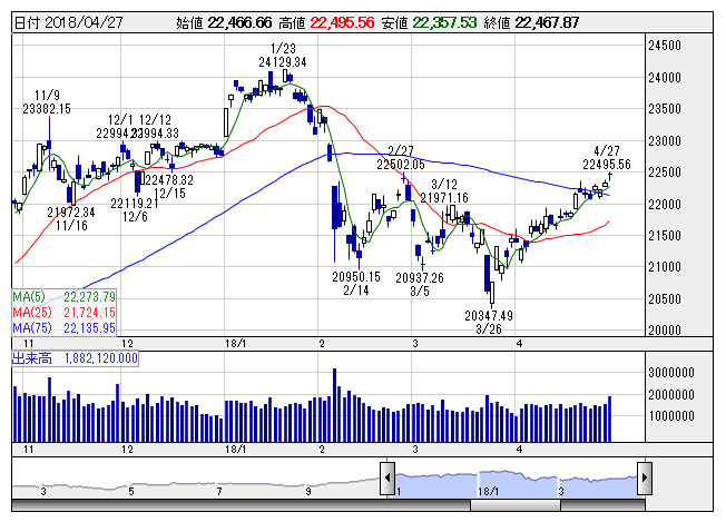 2018年04月28日10時15分 【市況】シカゴ日経平均先物 大取終値比 60円安 (4月27日) 日経平均 <日足> 「株探」多機能チャートよりシカゴ日経225先物6月限 (円建て) 22450 ( -60 ) シカゴ日経225先物6月限 (ドル建て) 22465 ( -45 ) ※( )は大阪取引所終値比 株探ニュース