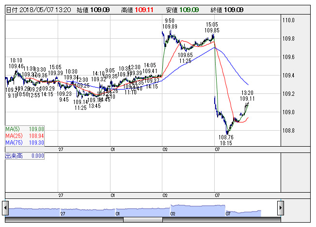 ドル円 <5分足> 「株探」多機能チャートより7日午後の東京市場でドル・円は109円10銭付近に値を戻す展開となっている。日経平均株価が2日終値付近まで持ち直し、リスク回避的なドル売り・円買いはさらに後退。ただ、米10年債利回りが2.953%付近で伸び悩んでおり、一段のドル買いは仕掛けづらいようだ。