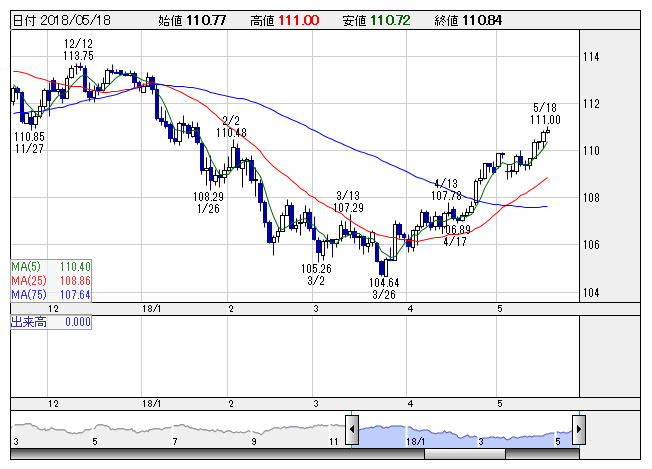 ドル円 <日足> 「株探」多機能チャートより18日のニューヨーク外為市場でドル・円は、111円02銭から110円61銭まで下落した。