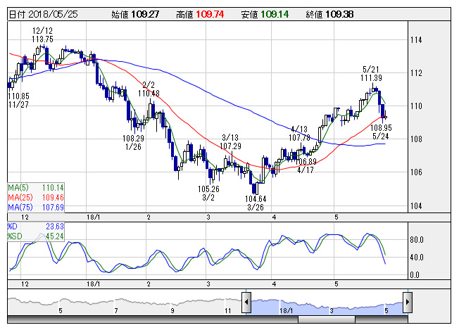 2018年05月25日19時01分 【通貨】外為:1ドル109円46銭前後と小幅なドル高・円安で推移 ドル円 <日足> Slowストキャス 「株探」多機能チャートより 25日の外国為替市場のドル円相場は午後7時時点で1ドル=109円46銭前後と、午後5時時点に比べ9銭の小幅なドル高・円安。ユーロ円は1ユーロ=128円19銭前後と35銭のユーロ高・円安で推移している。 株探ニュース
