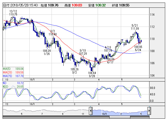 2018年05月28日16時01分 【通貨】外為:1ドル109円44銭前後と小幅なドル高・円安で推移 ドル円 <日足> Slowストキャス 「株探」多機能チャートより 28日の外国為替市場のドル円相場は午後4時時点で1ドル=109円44銭前後と、前週末午後5時時点に比べ7銭の小幅なドル高・円安。ユーロ円は1ユーロ=128円11銭前後と27銭のユーロ高・円安で推移している。 株探ニュース