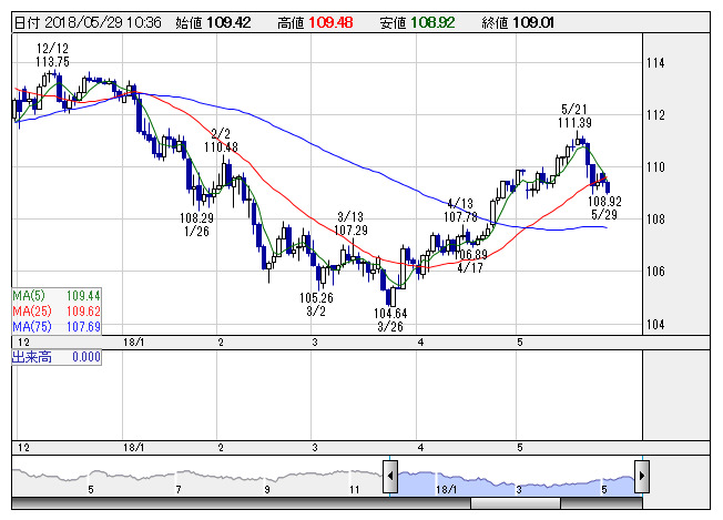 ドル円 <日足> 「株探」多機能チャートより■NY株式:メモリアルデーの祝日のため休場