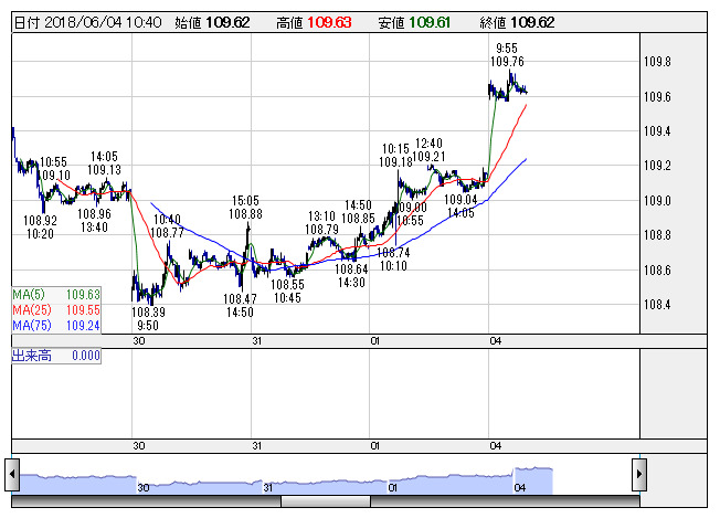 2018年06月04日11時01分 【通貨】外為:1ドル109円59銭前後とドル高・円安で推移 ドル円 <5分足> 「株探」多機能チャートより 4日の外国為替市場のドル円相場は午前11時時点で1ドル=109円59銭前後と、前週末午後5時時点に比べ40銭のドル高・円安。ユーロ円は1ユーロ=128円09銭前後と55銭の大幅なユーロ高・円安で推移している。 株探ニュース