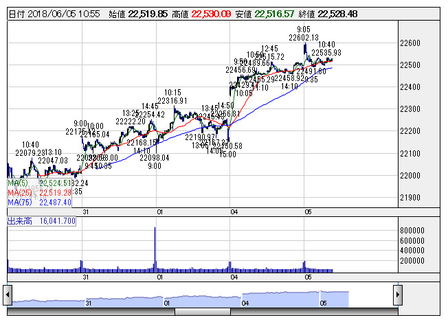 2018年06月05日11時19分 【市況】日経平均がマイナス転換 日経平均 <5分足> 「株探」多機能チャートより 日経平均株価がマイナス転換。11時18分現在、5.83円安の2万2470.11円まで下落している。 株探ニュース