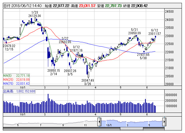 【市況】日経平均12日大引け=続伸、74円高の2万2878円