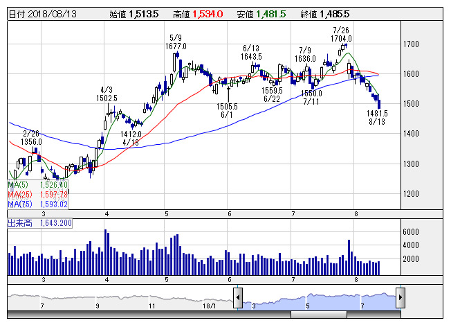 また、アノマリーから8月相場の弱さは想定されていたものの、外部環境に振らされにくい中小型株も断続的な売りに押されるなど、需給状況の悪さが窺える状況である。メルカリ<4385>ショックが続きマザーズ指数が1000Ptを割り込んでおり、個人の追証なども膨らむとの見方がある。物色対象に広がりが見られず、昨日の中小型株ではテリロジー<3356>など強い動きをみせている銘柄に短期資金も集中している状況。引き続きイレギュラー的な価格形成が付きやすく、ボトム形成を見極めながら好業績銘柄などへの押し目拾いのスタンスになりそうだ。