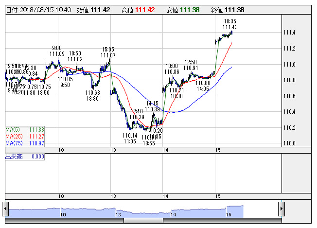 2018年08月15日11時01分 【通貨】外為:1ドル111円33銭前後とドル高・円安で推移 ドル円 <5分足> 「株探」多機能チャートより 15日の外国為替市場のドル円相場は午前11時時点で1ドル=111円33銭前後と、前日午後5時時点に比べ24銭のドル高・円安。ユーロ円は1ユーロ=126円30銭前後と57銭の大幅なユーロ安・円高で推移している。 株探ニュース