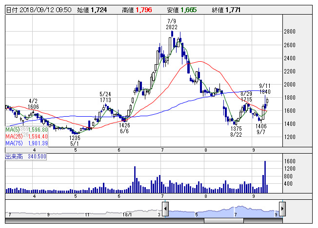 3920>が大幅高、一時10%高で1800円台目前まで上値を伸ばした。今週に入りにわかに動意づき、5日・25日移動平均線のゴールデンクロス示現から底値離脱を鮮明としている。ソフト開発やICTインフラ性能監視などを手掛けるほか、ブロックチェーン技術を活用したセキュリティーサービスなどに対する期待も高い。世界的に企業のクラウド活用が進んでおり、米国株市場ではアマゾンがアップルに続く時価総額1兆ドル台乗せを果たしたが、これはクラウドサービス「AWS」を成長エンジンに業績を拡大させたことが背景にある。日本でもシステム開発企業の間ではクラウド分野で商機を捉えようとする動きが活発だ。同社は8月末にクラウド型情報監視サービスの提供を開始、この流れに乗り株価も再評価の動きにある。また、足もとの業績も好調、18年9月期は営業16%増益と2ケタ伸長を見込んでいるが、一段の上方修正期待もある。