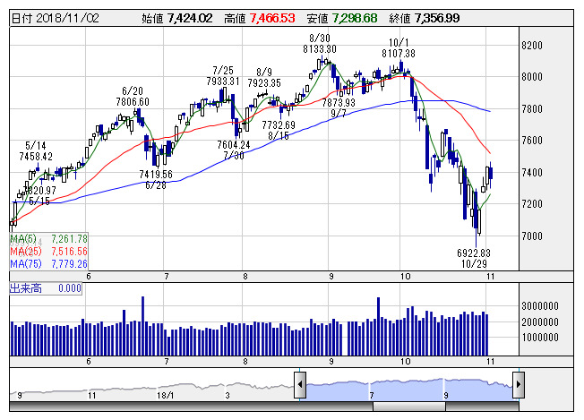 米国株式相場は下落。ダウ平均は109.91ドル安の25270.83、ナスダックは77.06ポイント安の7356.99で取引を終了した。トランプ大統領が中国との貿易交渉合意にむけた草案作成を指示したことが報じられ、アジア・欧州株がほぼ全面高となり、米国株にも買いが先行。しかし、10月雇用統計で非農業雇用者数が前月比25万人増と予想を大きく上振れ、平均時給の伸びも改善したことから利上げペースの拡大が意識されたほか、アップル(AAPL)の決算が嫌気されて下落に転じ、その後も下げ幅をやや拡大した。セクター別では、消費者・サービスや電気通信サービスが上昇する一方でテクノロジー・ハード・機器や半導体・半導体製造装置が下落した。