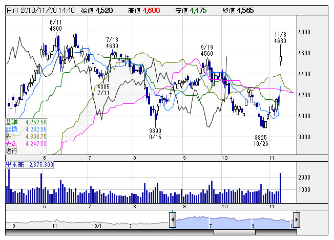 3)株価が均衡表の「雲(抵抗帯)」を上回る