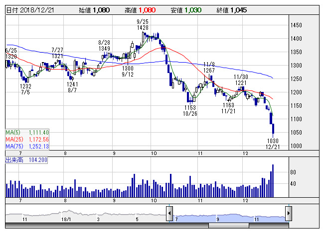片倉 <日足> 「株探」多機能チャートより※この業績予想は2018年12月10日に執筆されたものです。最新の情報が反映されていない場合がありますのでご了承ください。