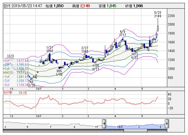 そーせい <日足> ボリンジャー/カイリ率 「株探」多機能チャートより●株価が+3σを上回った銘柄(市場人気順) ★株価の上げ足が速過ぎ、売りが出やすい銘柄