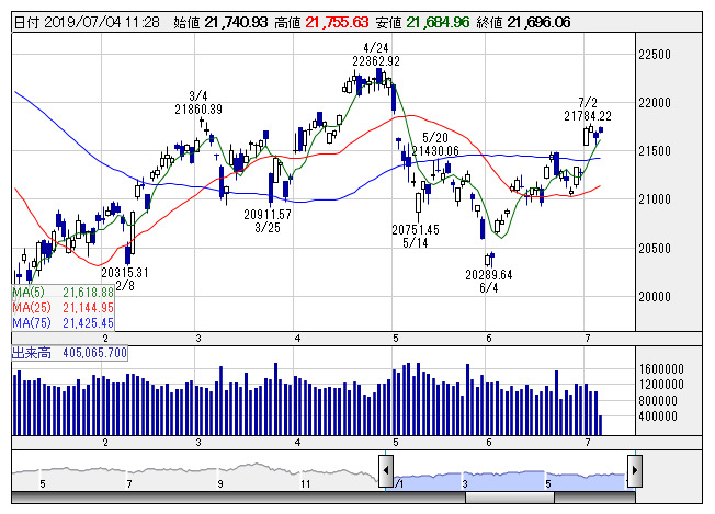 まず同レポートでは、『日本株市場は、米利下げ期待の高まり、G20(20ヵ国・地域)サミットでの米中首脳会談で通商協議の継続が決まったことなどを背景に息を吹き返している。日経平均は、6月4日に底打ちして以降、昨日までで6.0%上昇。個別では、オークマ(6103):+11.0%、アマダHD(6113):+10.5%、牧野フ(6135):19.1%、DMG森精(6141):+33.6%、SMC(6273):+14.7%、ファナック(6954):+9.0%と、工作機械関連銘柄の上昇が目立つ。また、東エレク(8035)など半導体関連株も同様に上昇しており、株式市場では先行きの景況感改善を前提にリスクを取る動きが出ている』と伝えています。