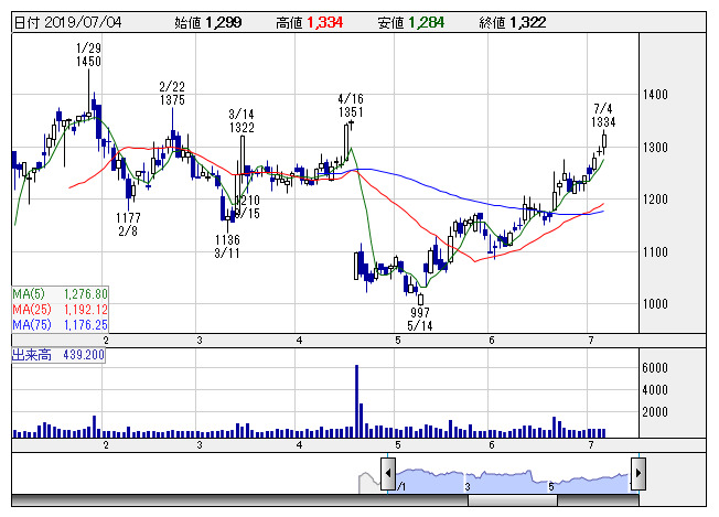 5月14日安値997円をボトムにリバウンドが継続しており、4月半ばに空けたマドを埋めており、急落前の水準を回復してきている。いったんは達成感が意識されやすいところではあるが、2月高値を起点とした調整トレンドラインの上限に到達してきており、ここからの一段高をみせてくると、中期トレンドラインが好転する。