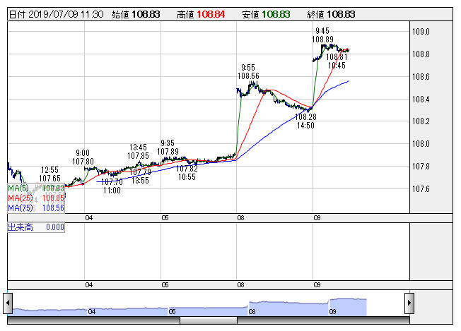 2019年07月09日12時01分 【通貨】外為:1ドル108円82銭前後とドル高・円安で推移 米ドル/円 <5分足> 「株探」多機能チャートより 9日の外国為替市場のドル円相場は午後0時時点で1ドル=108円82銭前後と、前日午後5時時点に比べ49銭のドル高・円安。ユーロ円は1ユーロ=121円99銭前後と32銭のユーロ高・円安で推移している。 株探ニュース