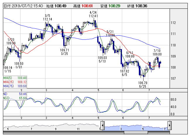 2019年07月12日16時01分 【通貨】外為:1ドル108円33銭前後とドル高・円安で推移 米ドル/円 <日足> Slowストキャス 「株探」多機能チャートより 12日の外国為替市場のドル円相場は午後4時時点で1ドル=108円33銭前後と、前日午後5時時点に比べ29銭のドル高・円安。ユーロ円は1ユーロ=122円10銭前後と27銭のユーロ高・円安で推移している。 株探ニュース