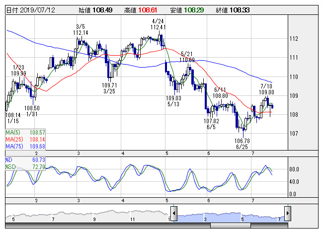 2019年07月12日18時01分 【通貨】外為:1ドル108円33銭前後と横ばい圏で推移 米ドル/円 <日足> Slowストキャス 「株探」多機能チャートより 12日の外国為替市場のドル円相場は午後6時時点で1ドル=108円33銭前後と、午後5時時点に比べ3銭のドル安・円高と横ばい圏。ユーロ円は1ユーロ=122円00銭前後と2銭のユーロ安・円高と横ばい圏で推移している。 株探ニュース