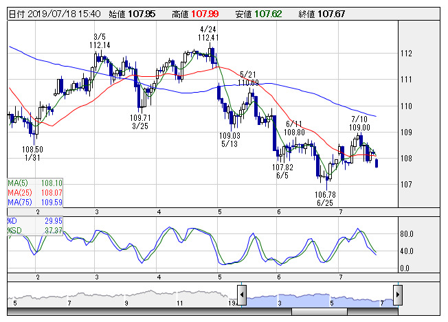2019年07月18日16時01分 【通貨】外為:1ドル107円69銭前後と大幅なドル安・円高で推移 米ドル/円 <日足> Slowストキャス 「株探」多機能チャートより 18日の外国為替市場のドル円相場は午後4時時点で1ドル=107円69銭前後と、前日午後5時時点に比べ54銭の大幅なドル安・円高。ユーロ円は1ユーロ=121円01銭前後と26銭のユーロ安・円高で推移している。 株探ニュース