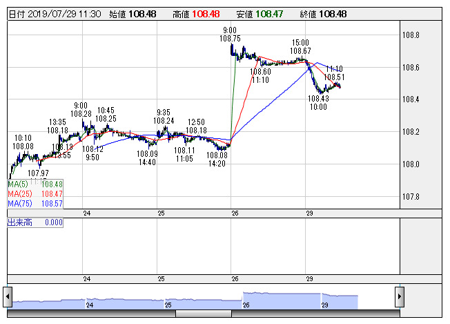2019年07月29日12時01分 【通貨】外為:1ドル108円51銭前後と小幅なドル安・円高で推移 米ドル/円 <5分足> 「株探」多機能チャートより 29日の外国為替市場のドル円相場は午後0時時点で1ドル=108円51銭前後と、前週末午後5時時点に比べ9銭の小幅なドル安・円高。ユーロ円は1ユーロ=120円79銭前後と10銭のユーロ安・円高で推移している。 株探ニュース