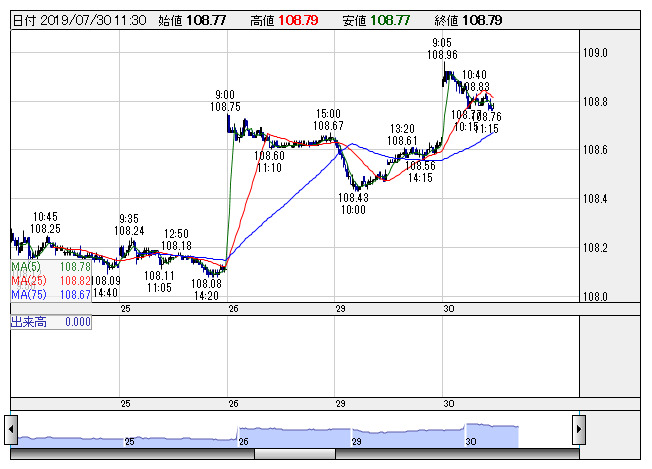 2019年07月30日12時01分 【通貨】外為:1ドル108円71銭前後と小幅なドル高・円安で推移 米ドル/円 <5分足> 「株探」多機能チャートより 30日の外国為替市場のドル円相場は午後0時時点で1ドル=108円71銭前後と、前日午後5時時点に比べ7銭の小幅なドル高・円安。ユーロ円は1ユーロ=121円10銭前後と31銭のユーロ高・円安で推移している。 株探ニュース